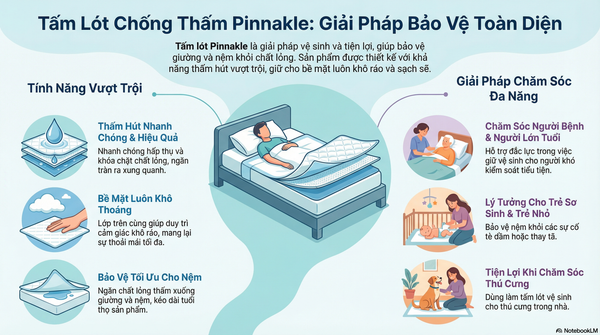 Tấm lót chống thấm là giải pháp đơn giản nhưng hữu ích để bảo vệ nệm, ga giường và hỗ trợ chăm sóc trẻ nhỏ, người lớn tuổi, người bệnh. Chọn đúng kích thước, đúng nhu cầu thấm hút và dùng đúng cách sẽ giúp tối ưu hiệu quả, giảm bẩn, giảm mùi và tiết kiệm thời gian vệ sinh. Với 3 lựa chọn Pinnakle (Light 60x60, Siêu thấm hút khử mùi, Premium 80x90), người dùng có thể dễ dàng chọn sản phẩm phù hợp cho từng tình huống trong gia đình.